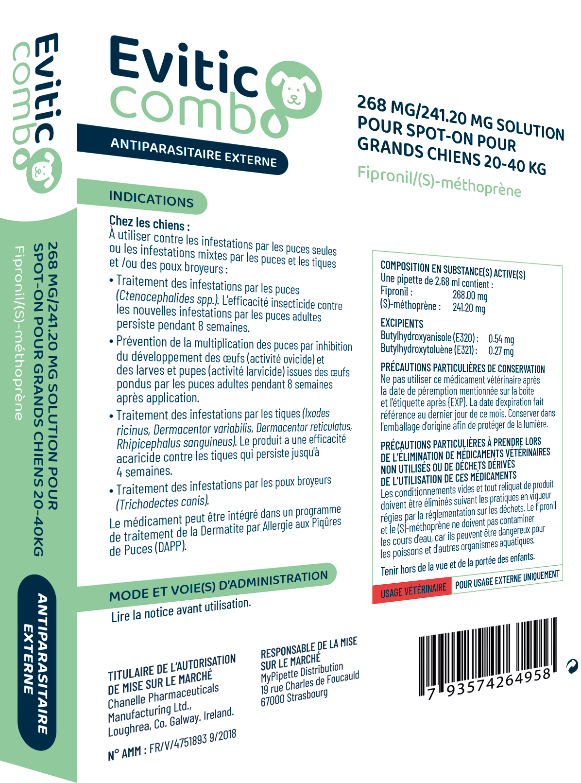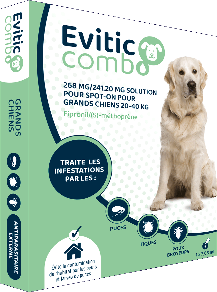 Traite les problèmes d’infestations de puces, tiques et poux broyeurs et prévient contre les puces et les tiques.