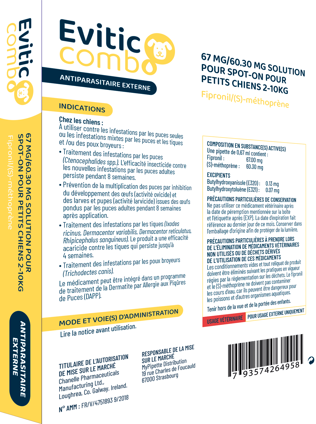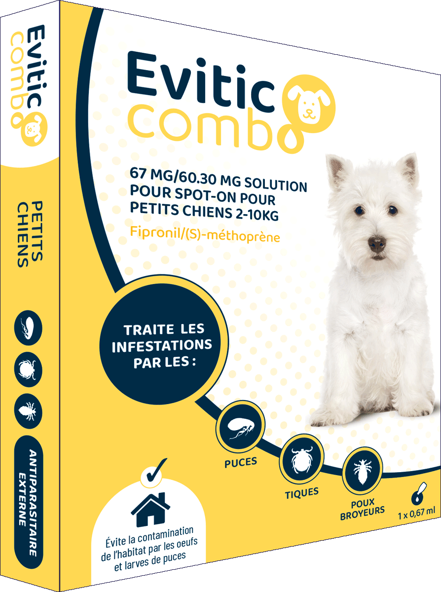 Traite les problèmes d’infestations de puces, tiques et poux broyeurs et prévient contre les puces et les tiques.